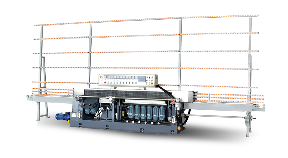 該機(jī)采用PLC控制,磨頭電機(jī)采用ABB電機(jī),主要用于玻璃底邊及前大倒角磨邊及拋光,其中前面五個(gè)馬達(dá)角度在0°~45°間任意可調(diào),并在觸摸顯示屏上顯示角度及倒角寬度,自動(dòng)磨削時(shí)可較準(zhǔn)確的調(diào)整和設(shè)置前倒角的各項(xiàng)參數(shù)。