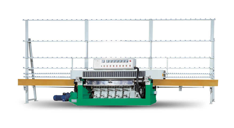 該機(jī)用于平板玻璃的圓邊、鴨嘴邊、直邊的磨削和拋光。前導(dǎo)軌可自由平行移動,可磨削不同厚度的玻璃,且在加工圓邊時(shí),前、后倒角磨輪的設(shè)置可大大的減輕后面圓邊輪的切削量,及能有效提高磨輪的使用壽命,大大的提高磨削速度。